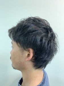 襟足は、刈り上げないくらいの絶妙な長さで サイドは、ふくらみやすいのでスッキリ刈り上げ! くせ毛と、パーマをいかしたスタイルです。